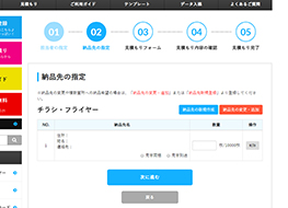 納品先の指定を確認し、次へ進むをクリックしてください。納品先を登録したい場合は、納品先新規登録をクリックしてください。納品先を変更・追加したい場合は、納品先を変更・追加をクリックしてください。
