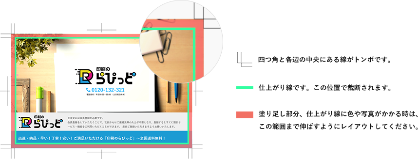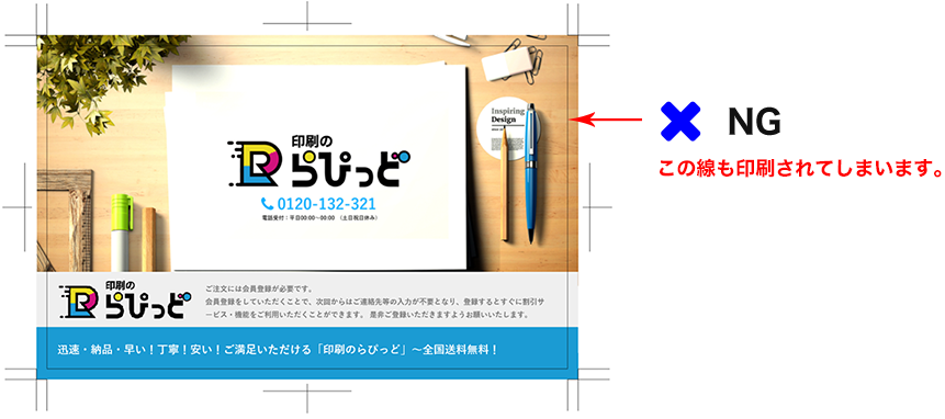 ※仕上げラインのギリギリにつけられますと断裁時のぶれなどによって線が残ってしまう恐れがございます。