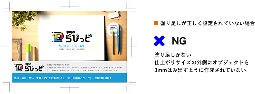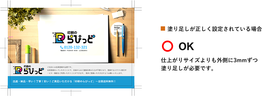 画像・線・図形など仕上がり線にかかるものは全て延ばす・拡大などして塗り足しを上下左右3mmずつつけてください。