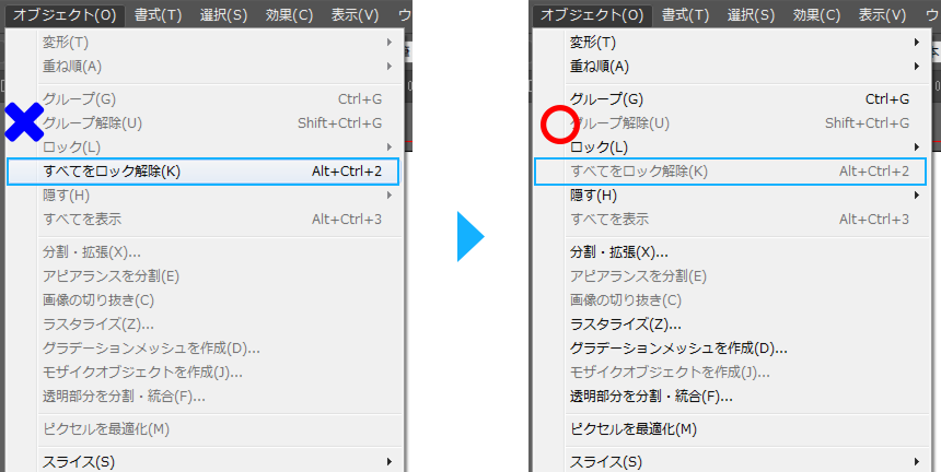 2「オブジェクト」→「すべてをロック解除」を選択