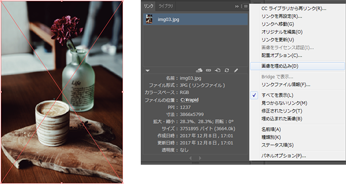 リンク画像を選択し、パレットメニューから「画像を埋め込み」を選択する。