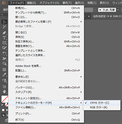 「ファイル」>「ドキュメントのカラーモード」がCMYKカラーになっていることを確認