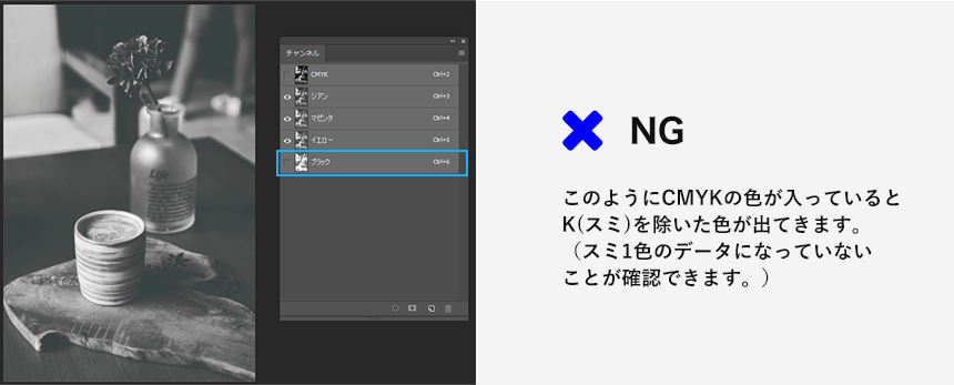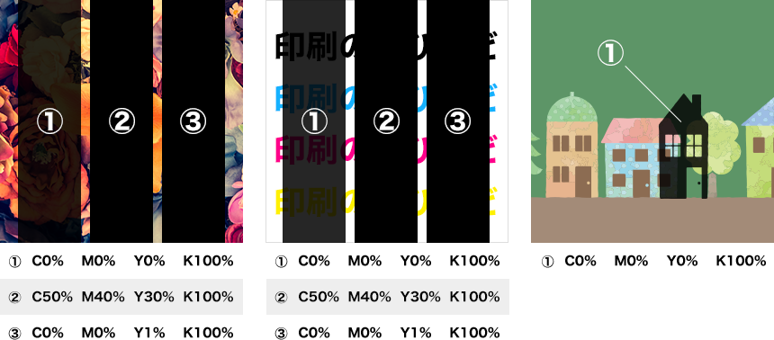どうしても透過を避けたいという場合にはいくつかの方法がありますが、図の②または③のようにK(ブラック)以外のCMYのいずれかに1%でも色を加えることで透過を避けることが可能です。