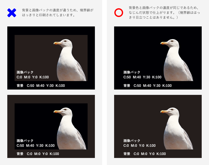 スミベタのオブジェクトの上に背景がブラックの画像を配置した場合、画面上では差がないように見えてもブラック部分の濃度差が違う場合、画像の縁が印刷されてしまいます。