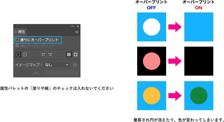 オーバープリントの設定を行うと意図しない仕上りになる場合がございますので、オーバープリントの設定は行わないでください。