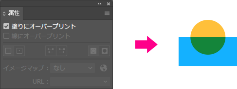 オーバープリントのチェックがついている場合、「オーバープリントプレビュー」にすると、下記のような変化がおこります。