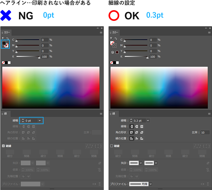 「線幅がゼロ(空欄)」のライン(罫線)のことをヘアラインと呼びます。画面やプリンタでは、ある程度の太さのある線として表現されますが、本機による印刷では、かすれたり消えてしまったりします。罫線には必ず線幅を設定してください。 ヘアラインが含まれたデータの場合も、データチェックにて確認させていただく内容の対象にならず、ご入稿データ通りでの進行となりますのでご注意下さい。 また、線幅が「0.3pt」以下の設定の場合、ヘアラインと同様、かすれなどの原因となりますのでご了承下さいませ。