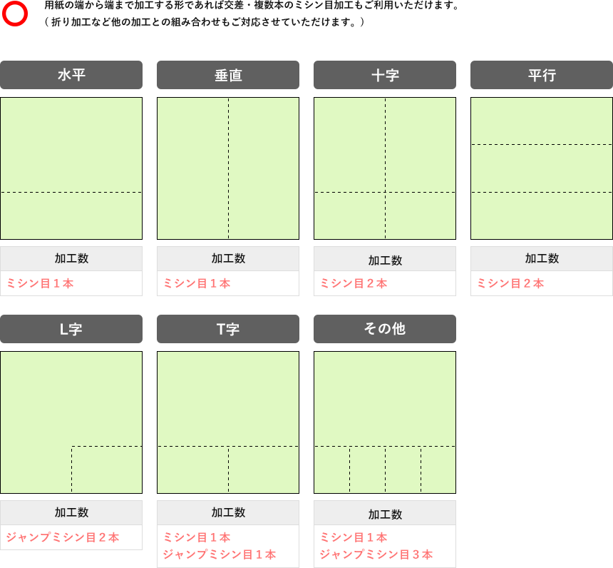 印刷物に折り目・ミシン目・スジ入れなどの加工をされる場合、加工位置については下記の方法にてお客様よりご指示いただきますようお願いいたします。
