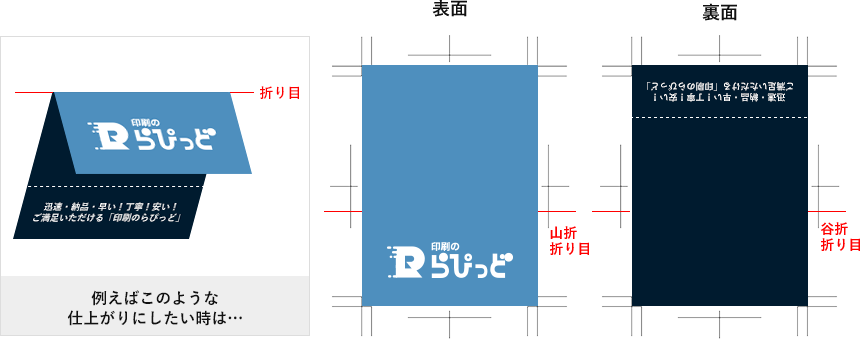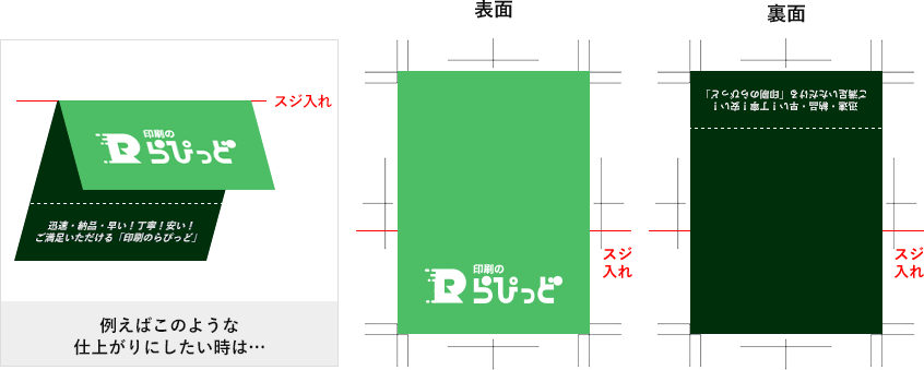 加工の指示線は、仕上げの外側(ヌリタシの外)にご入力下さい(「表面「裏面」のご指示もご入力お願いいたします)。また、トラブルが起こらないために「折り目」・「ミシン目」・「スジ入れ」など適当な文字のご記入をお願いします。