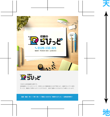 縦型のデザインデータの印刷に加工をご希望される際は、特に天地の関係性にご注意ください。天地指定の表示を必ずお願いいたします。