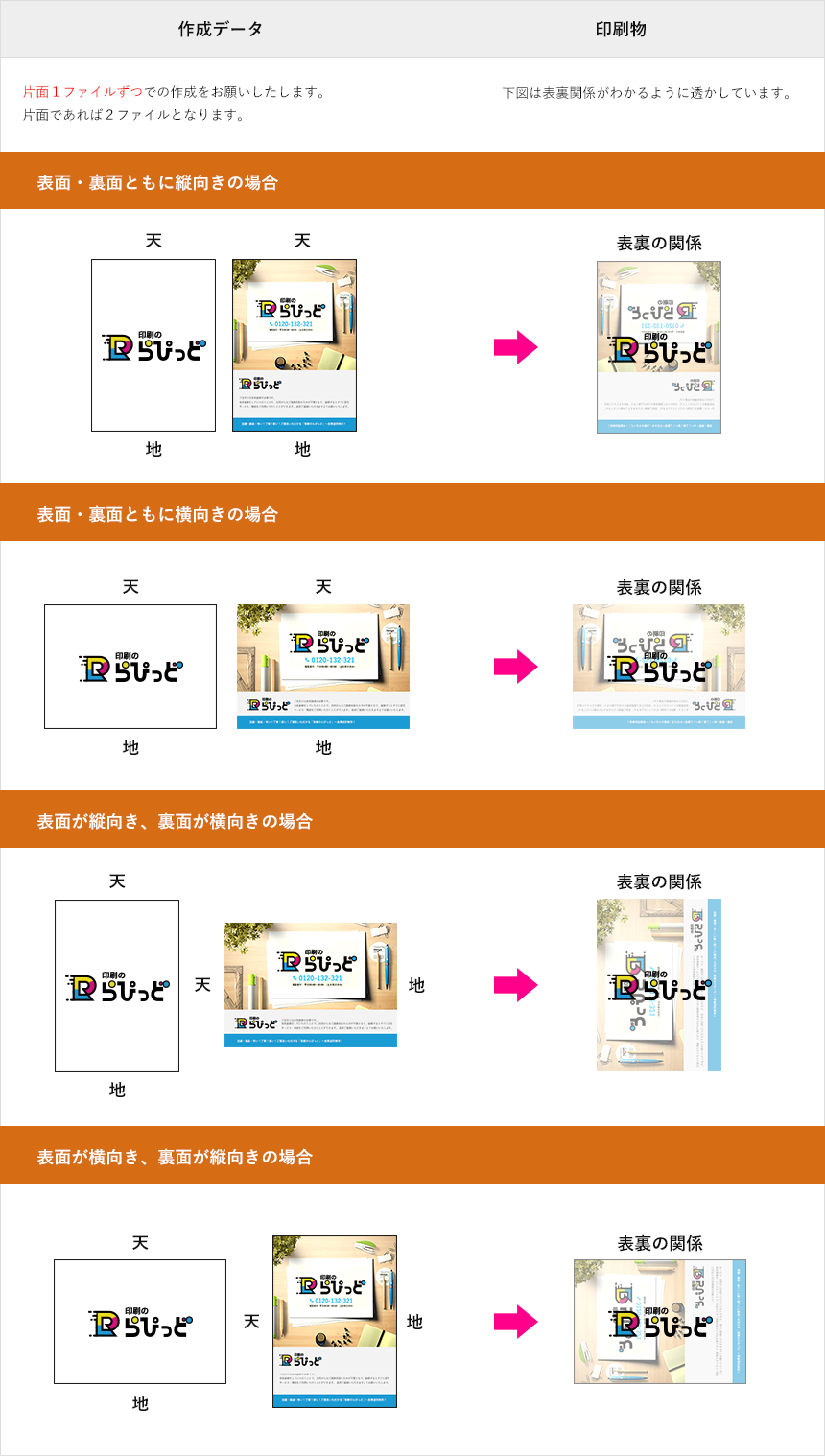 両面印刷を希望されるとき、作成データからの表裏関係判断が困難な場合がございますので作成データ(トンボの外など)に天地指定の表示を御願いします。