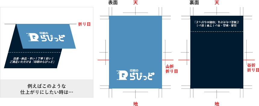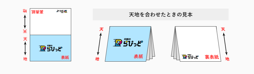 天地の向きにつきましては、原則「合わせ面パターン」でご案内通りの、表裏関係で印刷を行わせていただいておりますが、ご入稿の際にはスクリーンショット(jpeg)にて、下記「天」「地」のご指示をいただきますようお願い申し上げます。