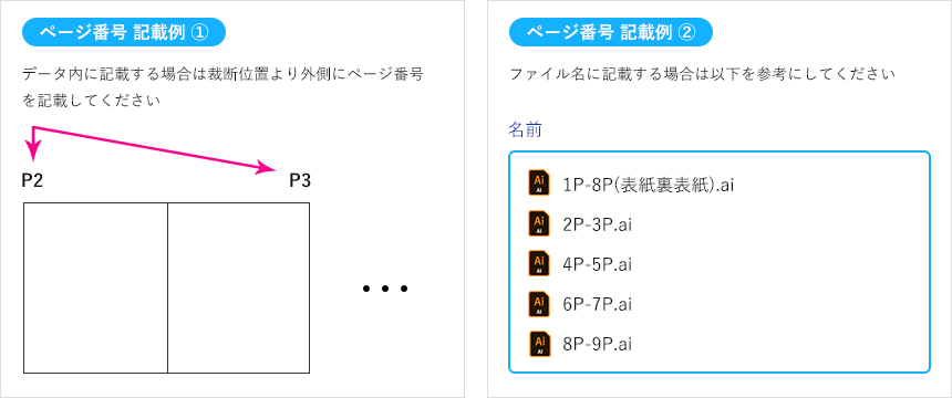 データ内にノンブル(ページ番号)が無い場合はページの順番・綴じ方向が分かるようにトンボの外などにご記載いただくか、もしくはファイル名にページの順番の指示をご明記ください。