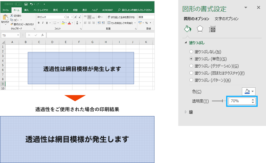 透過性をご使用された場合、実際の印刷物では下図のように網目模様になる場合がございますので、透過性はご使用にならないようお願いたします。
