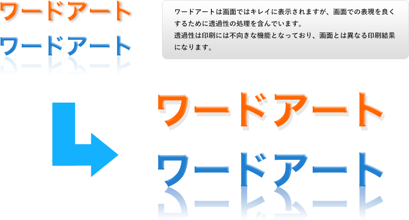 しかし、これらの効果は印刷には不適切な効果となっており、上記の設定を行うと意図しない仕上がりになる場合がございますので、「ワードアート」はご使用されないようにお願いいたします。