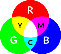 RGBとはRed(赤)・Green(緑)・Blue(青)の合成による発色方式です。パソコンなどのモニターやデジタルカメラの色表現に用いられ、赤・緑・青(RGB)の3色が掛け合わさるることで白に近づきます。(色が混ざるほど明るくなり、白に近づくため加法混色とも言います)