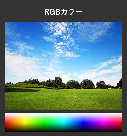 RGBとはRed(赤)・Green(緑)・Blue(青)の合成による発色方式です。パソコンなどのモニターやデジタルカメラの色表現に用いられ、赤・緑・青(RGB)の3色が掛け合わさるることで白に近づきます。(色が混ざるほど明るくなり、白に近づくため加法混色とも言います)