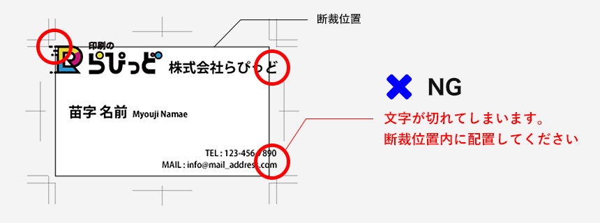 文字データが仕上がりサイズの外側にかかるようなデザインの場合も、原則、ご入稿データ通りでの進行となりますのでご注意下さい。